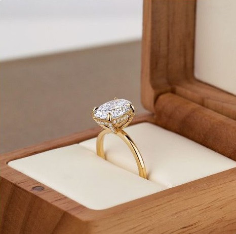 Como o nome sugere, um diamante de corte oval é um tipo de corte de diamante, com uma forma simétrica, alongada e arredondada. Com sua área de superfície maior, os diamantes ovais otimizam o peso em quilates - o que significa que geralmente parecem maiores do que um diamante redondo com o mesmo peso em quilates.